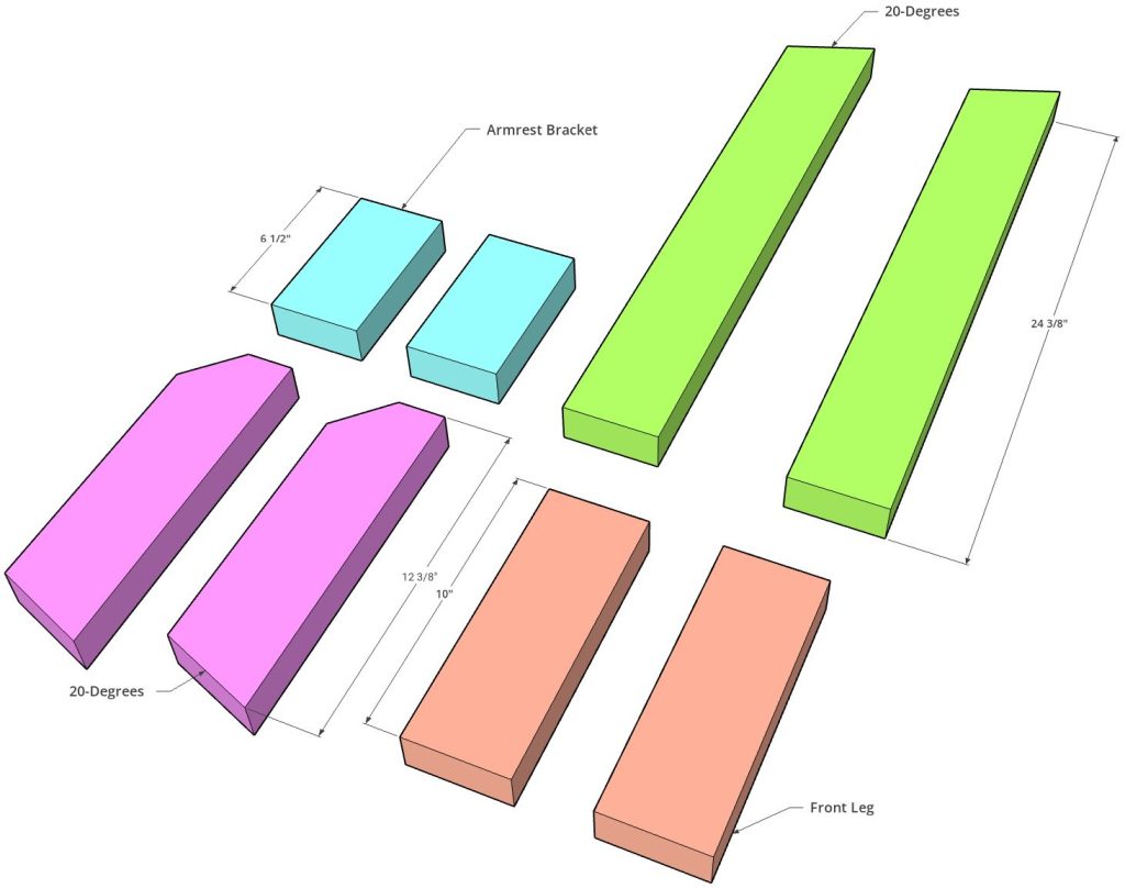 Before attaching them, improve the appearance by trimming the front corners of each board at a 45-degree angle. This removes sharp edges and gives the armrests a cleaner, more finished look.